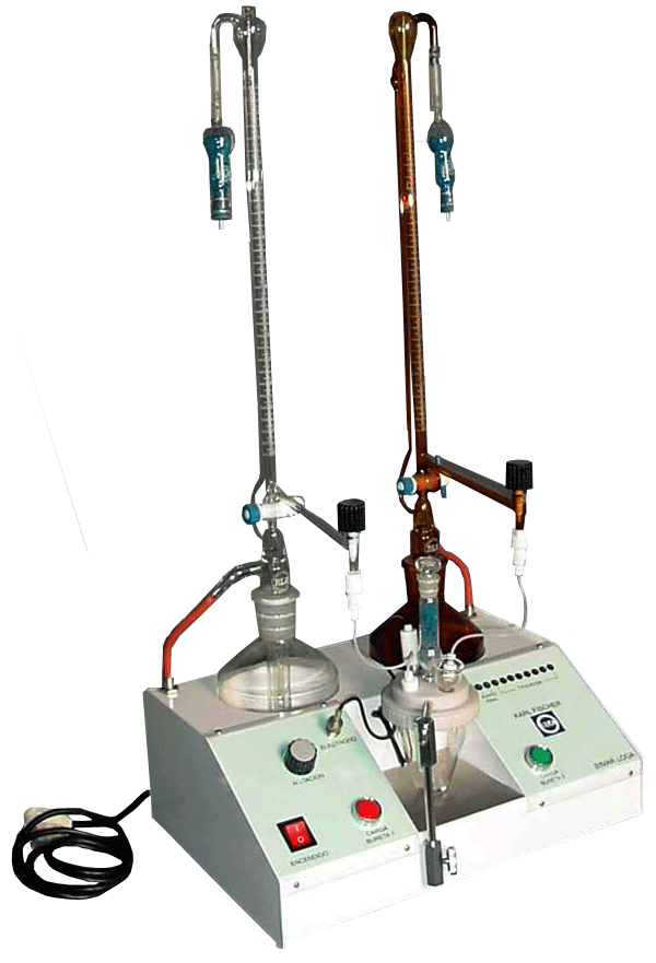 Equipo para determinaci贸n de humedad por m茅todo Karl-Fischer, Modelo gabinete donde se unifican todos los elementos que comprenden al equipo, que consta de: 2 buretas autom谩ticas de vidrio con frasco dep贸sito de 1.000 ml. Una incolora para metanol y otra en color caramelo tratada con pintura inact铆nica para no alterar el reactivo a dosificar ya que es fotosensible a la luz. Caracter铆sticas descriptivas de las buretas: Escala graduada con cero autom谩tico hasta 15 ml con escala de apreciaci贸n 0,05 ml de alta precisi贸n, con control de calidad de su graduado, cero autom谩tico sistema Squibb y no de carga interna para evitar el error del doble menisco, numeraci贸n y escala en blanco para facilitar su lectura, la presi贸n al dep贸sito del reactivo se genera por una bomba el茅ctrica para cada bureta, su aire pasa por un dep贸sito con v谩lvula de cierre que obliga a recorrer un circuito de filtraci贸n para extraer su humedad, en su parte superior dispone de otro filtro para el venteo de la bureta. En la base de la escala graduada dispone de una llave de tefl贸n para recuperar el reactivo sobrante luego de la titulaci贸n y devolverlo al frasco para evitar su alteraci贸n.